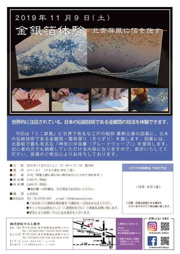 - 今回は世界で有名な江戸の絵師 葛飾北斎の図案と、日本の伝統技術である金銀箔を掛け合わせた『ミニ屏風』に挑戦していただけます。図案には、北斎絵で最も有名な『神奈川沖浪裏(グレードウェーブ)』を使用します。初心者の方でも挑戦していただける内容になりますので、是非いらしてください。皆様のご参加心よりお待ちしております。
