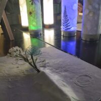 講習内容 6月の季節を感じる朝顔や千鳥を雲母摺りし、花火を「うちわ」に金銀箔で施します。 金銀箔の扱い方・説明 ・砂子箔 ・切箔 ・雲母摺(あさがお・ちどりの型を使…