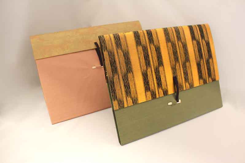 今回の和綴じ体験教室では、1300年の歴史のある伝統織物の表装裂地を使用し、裏打し、オリジナルファイルを制作して頂きます。表装裂地は、マスミショールームで販売している数百種類の裂地の中でご自分で選んでいただきますので、あなただけの逸品をお作り頂けます。また、表装裂地を使って表紙を作る基本の技術を学べる教室となっておりますので、初心者の方でも簡単に制作して頂くことができます。お気軽にご参加下さい。